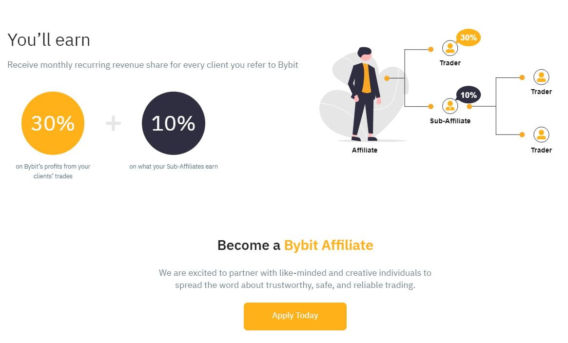 Bybit owes much of its rapid growth to its referral program, also known as the affiliate program. This program offers substantial rewards, allowing you to earn up to 1025 USDT and receive a 30% commission from the trading fees of users who sign up using your referral link. Additionally, you'll enjoy a 10% discount on the trading fees of sub-affiliates who register under your direct affiliates.